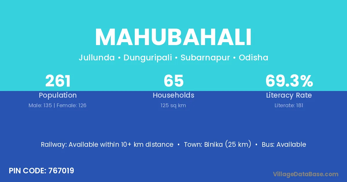 Binika (25 km) is the nearest town to Mahubahali village for major economic activities and is located approximately 25 km away.