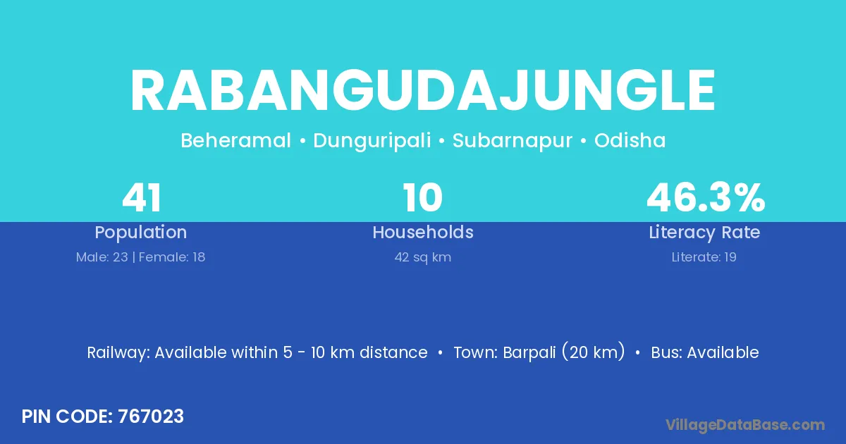 Rabangudajungle village has a total population of 41 people, of which 23 are males and 18 are females.