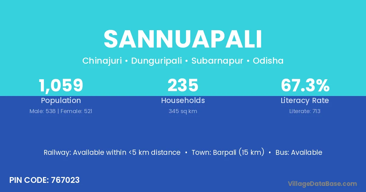 Sannuapali village has a total population of 1,059 people, of which 538 are males and 521 are females.