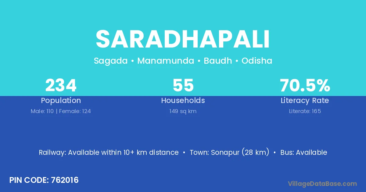 The literacy rate of Saradhapali village is 55.64%. Male literacy stands at 63.20% and female literacy at 48.48%.