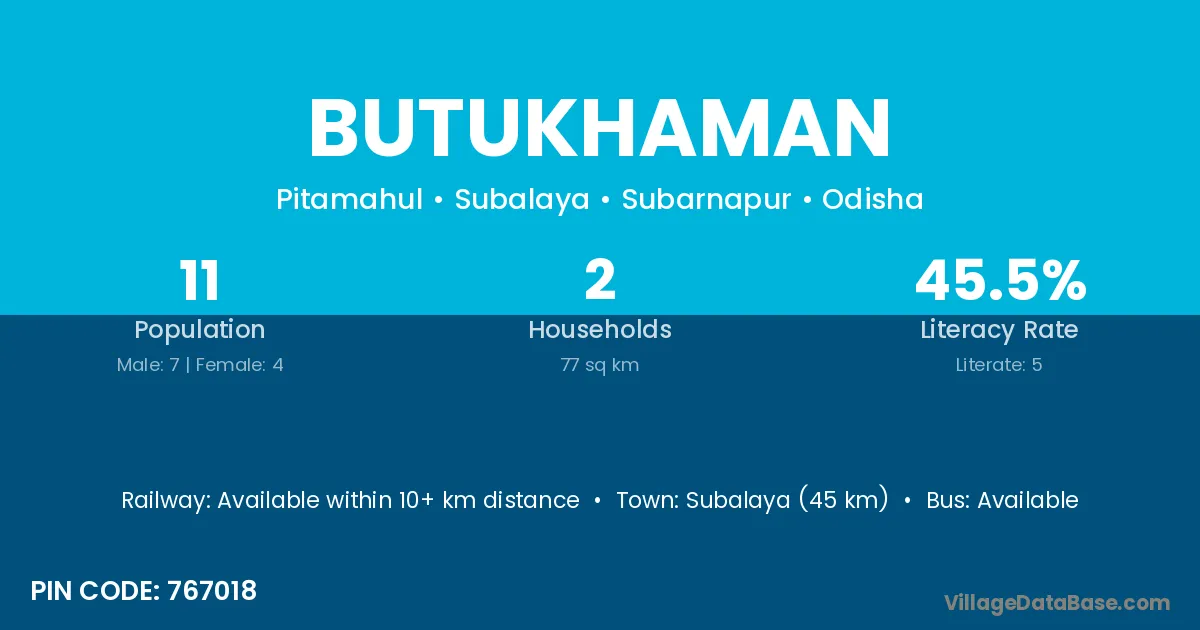 Subalaya (45 km) is the nearest town to Butukhaman village for major economic activities and is located approximately 45 km away.