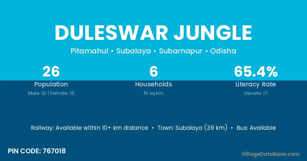 Subalaya (39 km) is the nearest town to Duleswar Jungle village for major economic activities and is located approximately 39 km away.