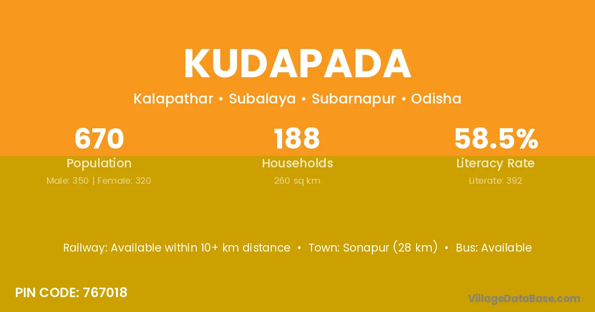 Kudapada village has a total population of 670 people, of which 350 are males and 320 are females.