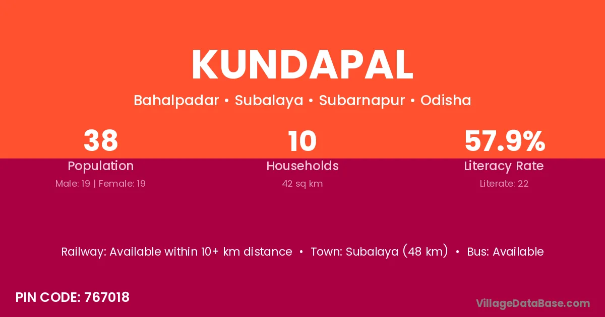 Kundapal village has a total population of 38 people, of which 19 are males and 19 are females.