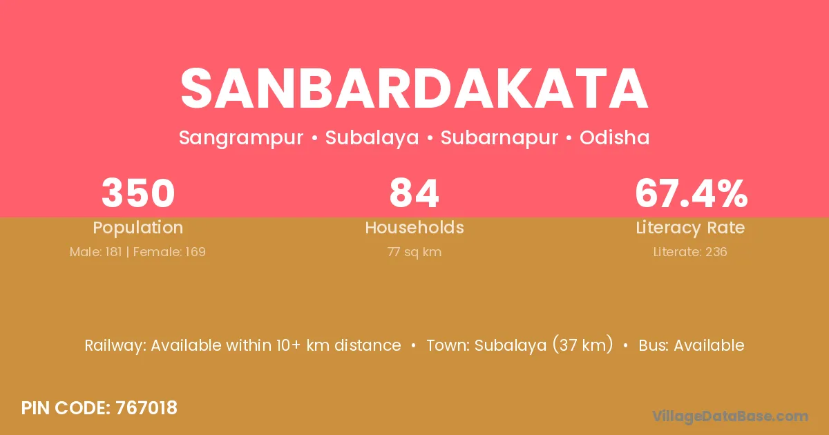 Subalaya (37 km) is the nearest town to Sanbardakata village for major economic activities and is located approximately 37 km away.
