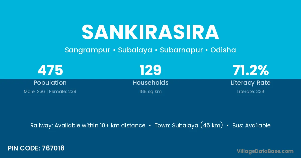 Sankirasira village has a total population of 475 people, of which 236 are males and 239 are females.
