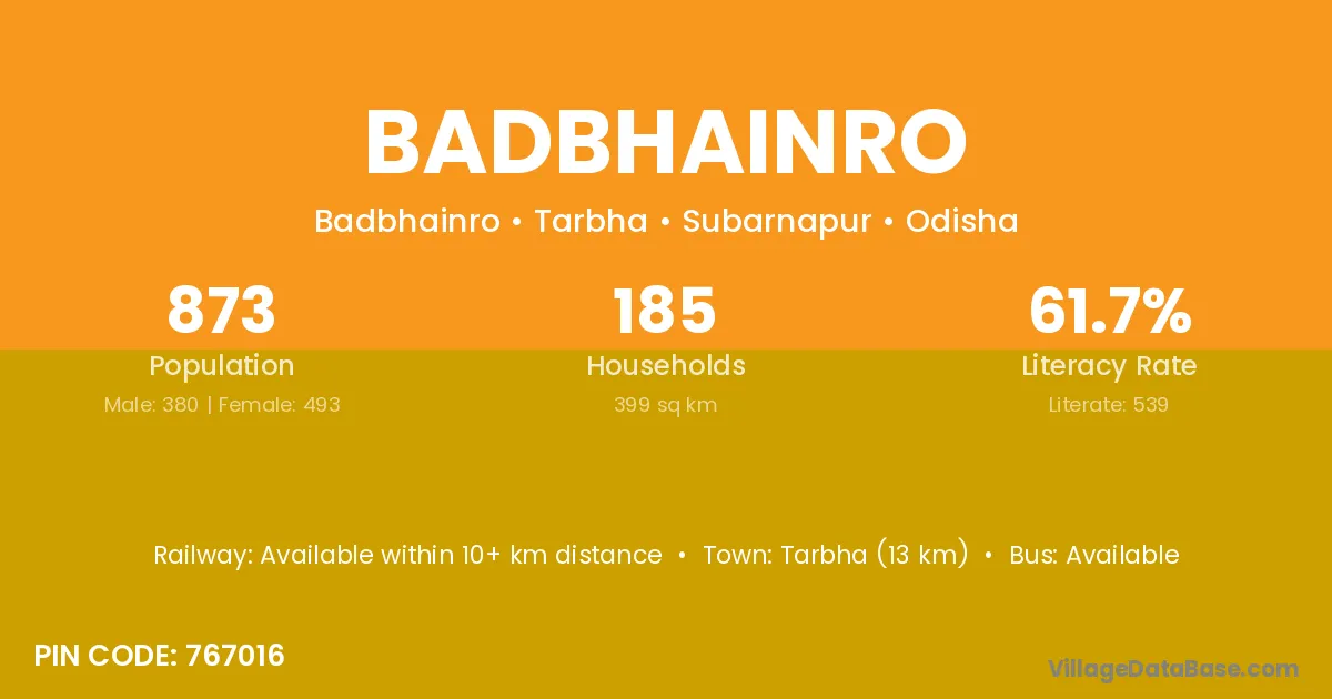 Tarbha (13 km) is the nearest town to Badbhainro village for major economic activities and is located approximately 13 km away.