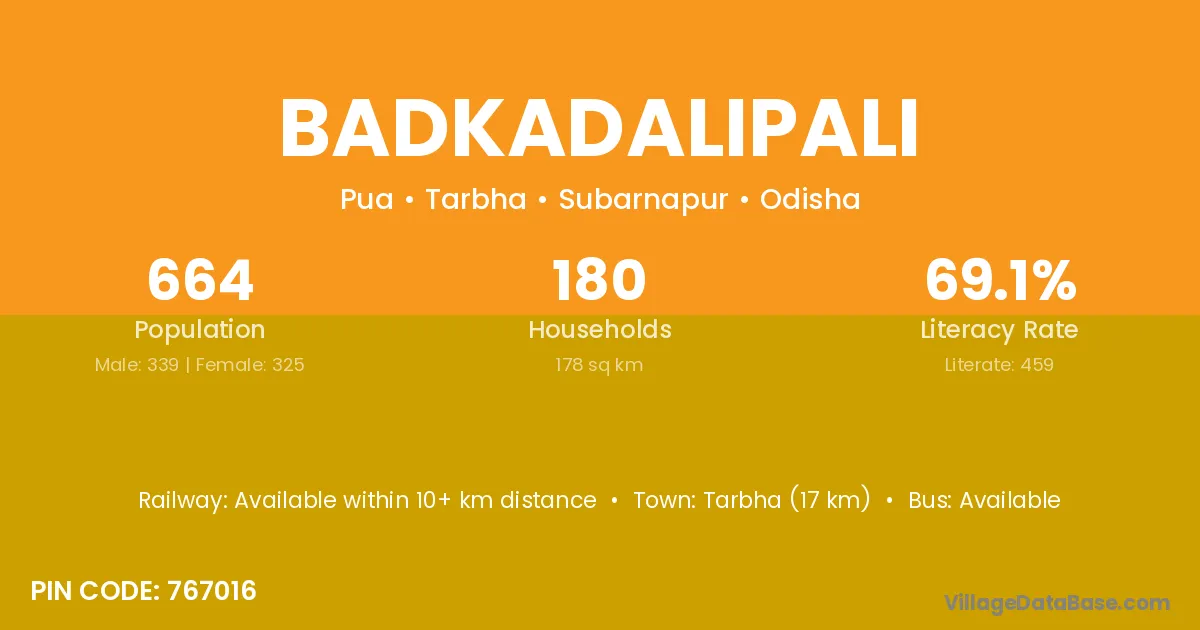 Tarbha (17 km) is the nearest town to Badkadalipali village for major economic activities and is located approximately 17 km away.
