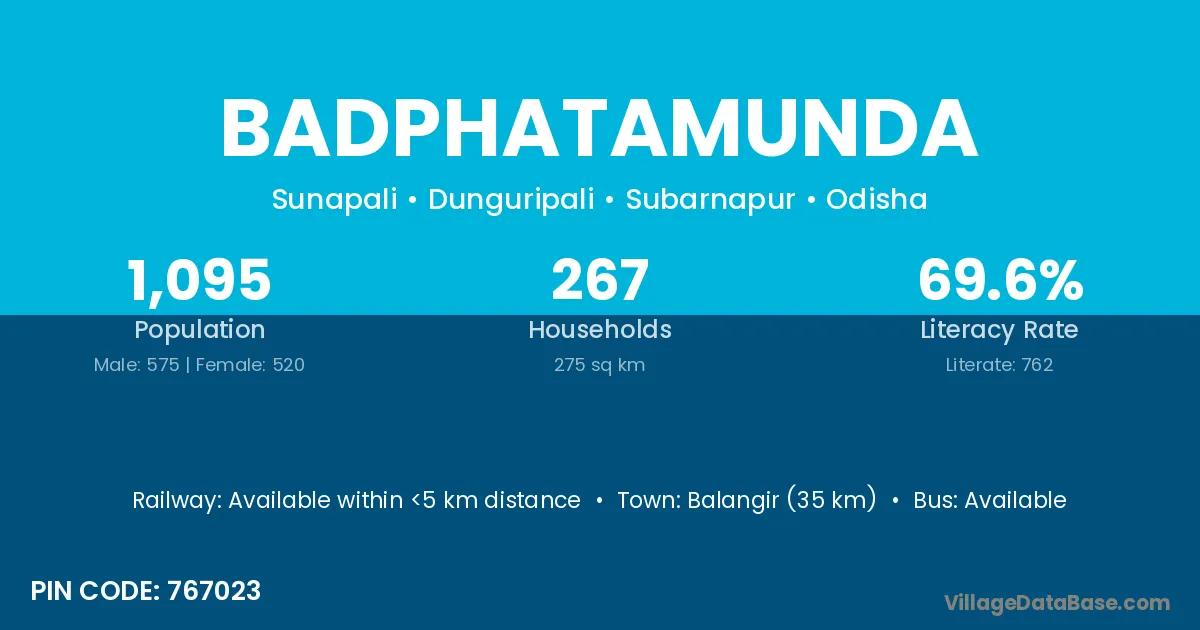 Tarbha (18 km) is the nearest town to Badphatamunda village for major economic activities and is located approximately 18 km away.