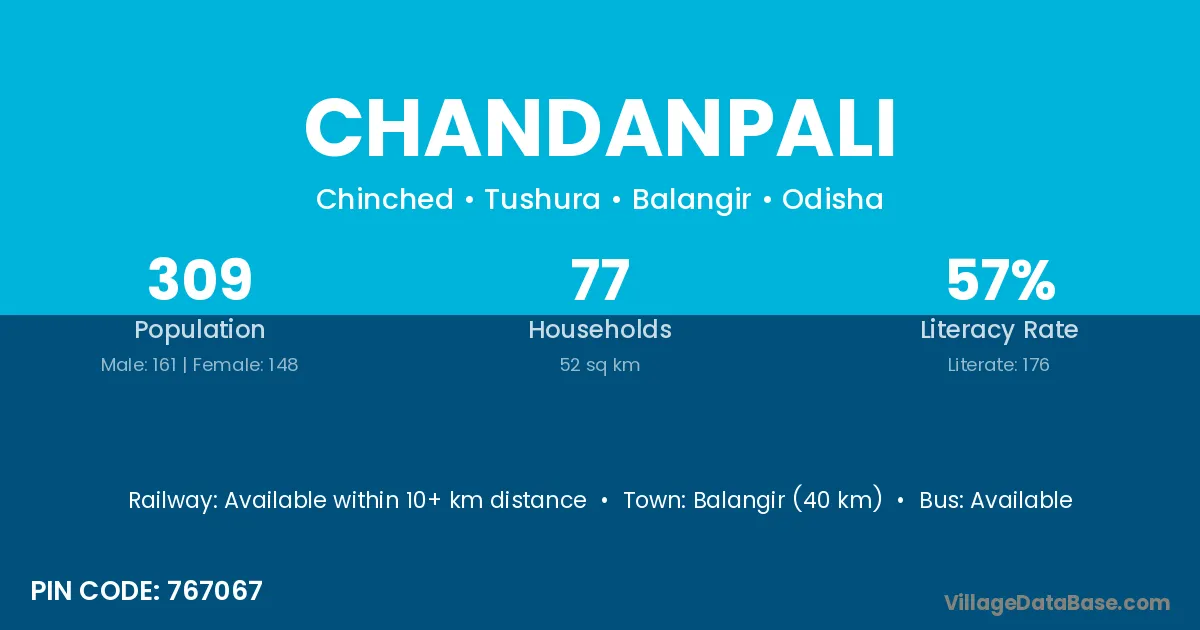 Tarbha (2 km) is the nearest town to Chandanpali village for major economic activities and is located approximately 2 km away.