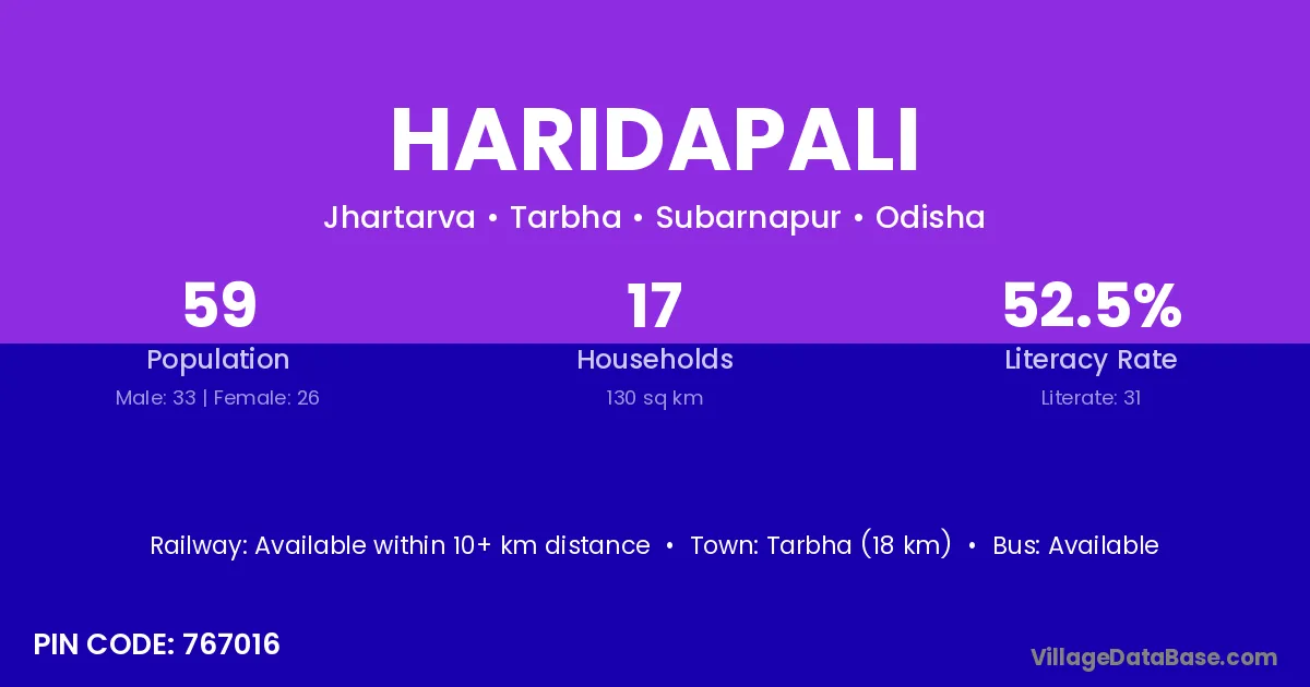Tarbha (18 km) is the nearest town to Haridapali village for major economic activities and is located approximately 18 km away.