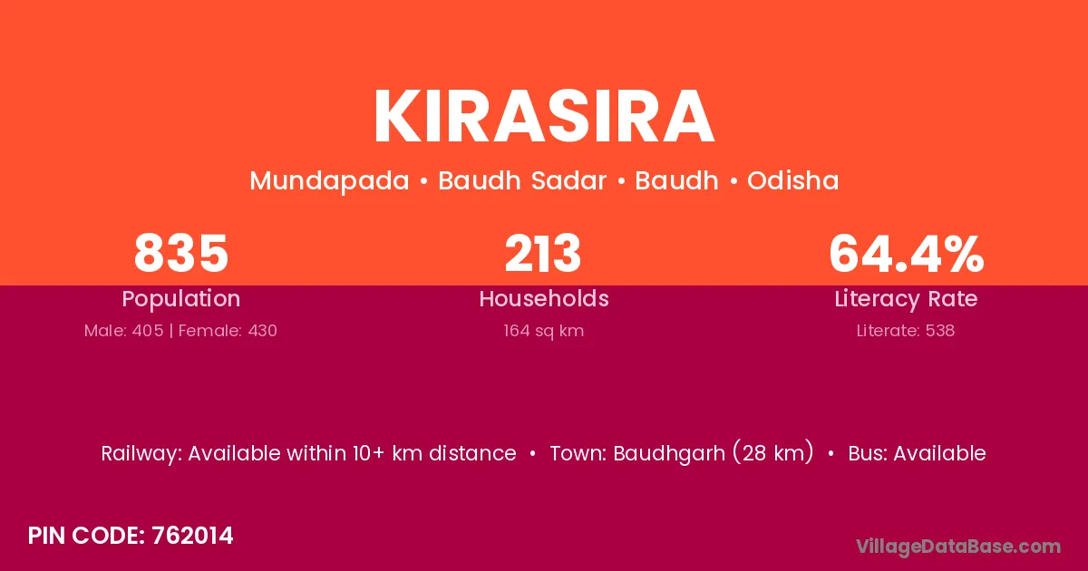 According to Census 2011 information, the village code of Kirasira village is 767016.