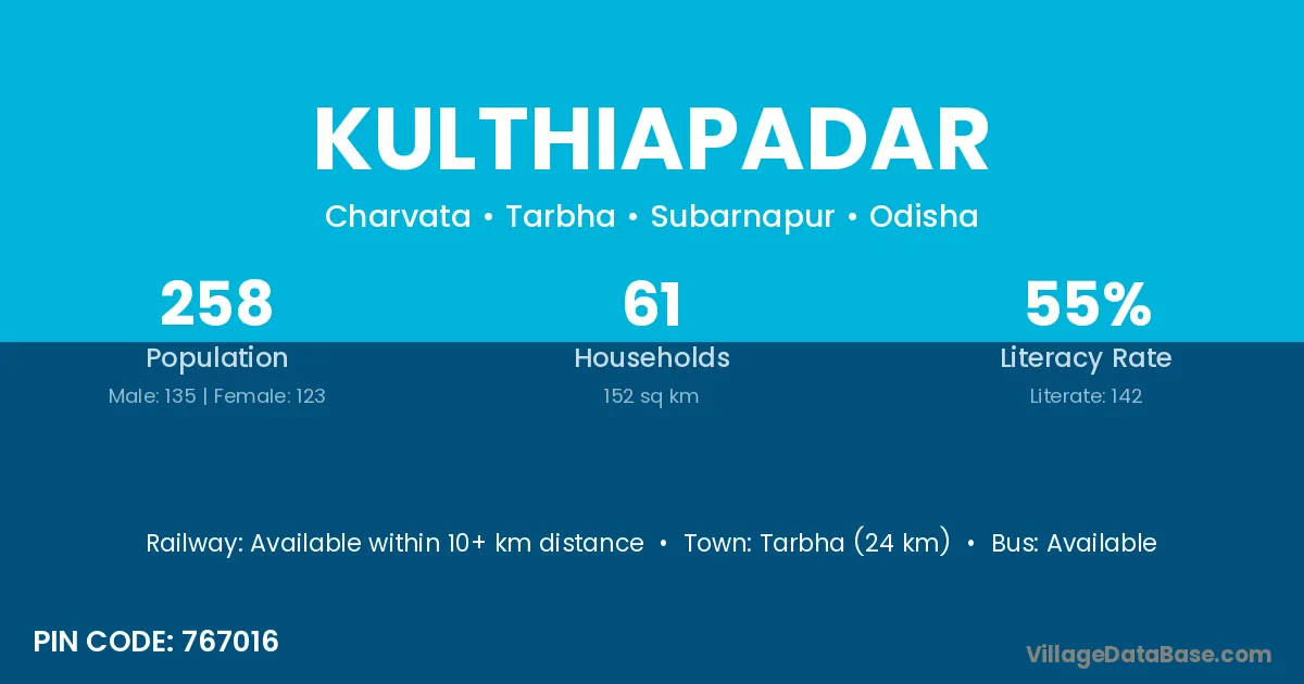 Tarbha (24 km) is the nearest town to Kulthiapadar village for major economic activities and is located approximately 24 km away.