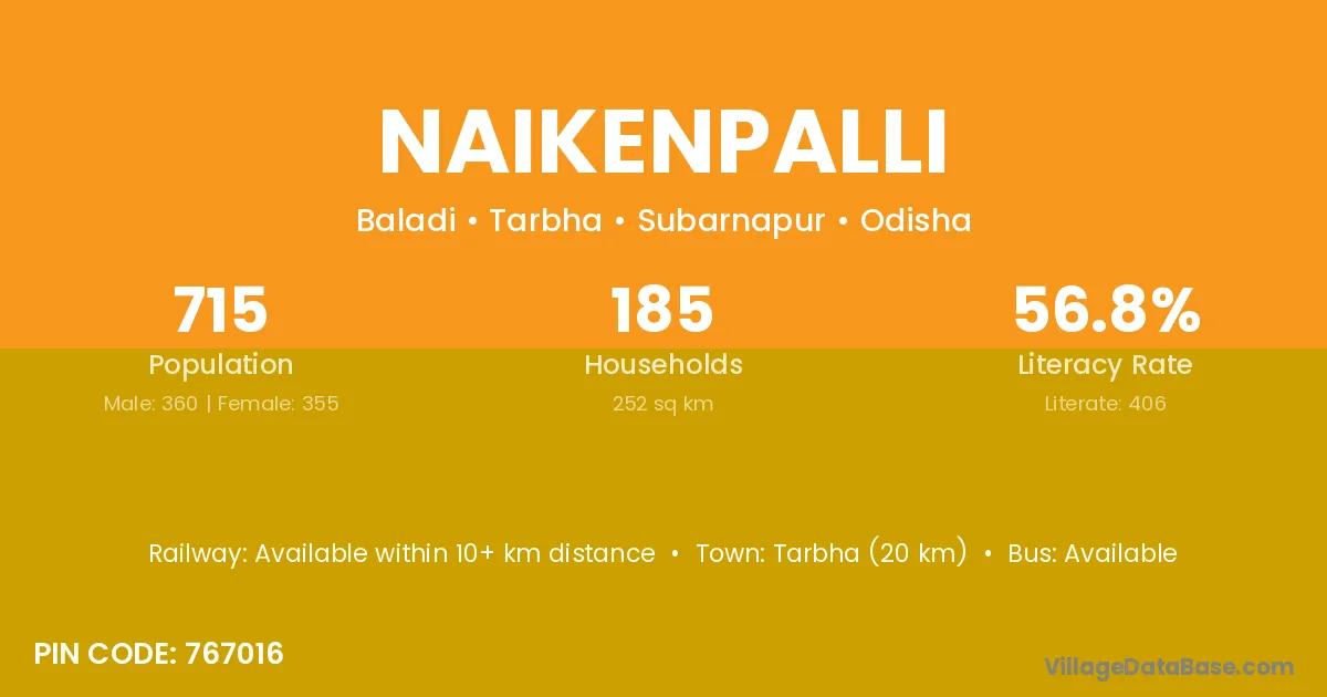 Tarbha (20 km) is the nearest town to Naikenpalli village for major economic activities and is located approximately 20 km away.