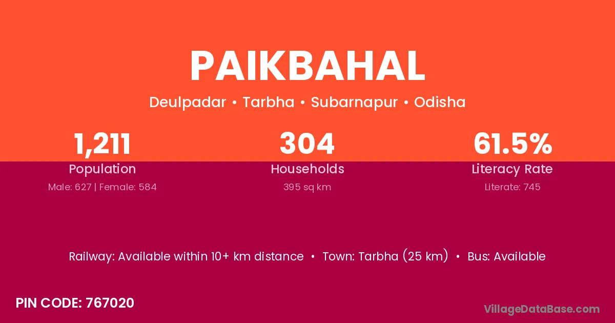 Tarbha (25 km) is the nearest town to Paikbahal village for major economic activities and is located approximately 25 km away.
