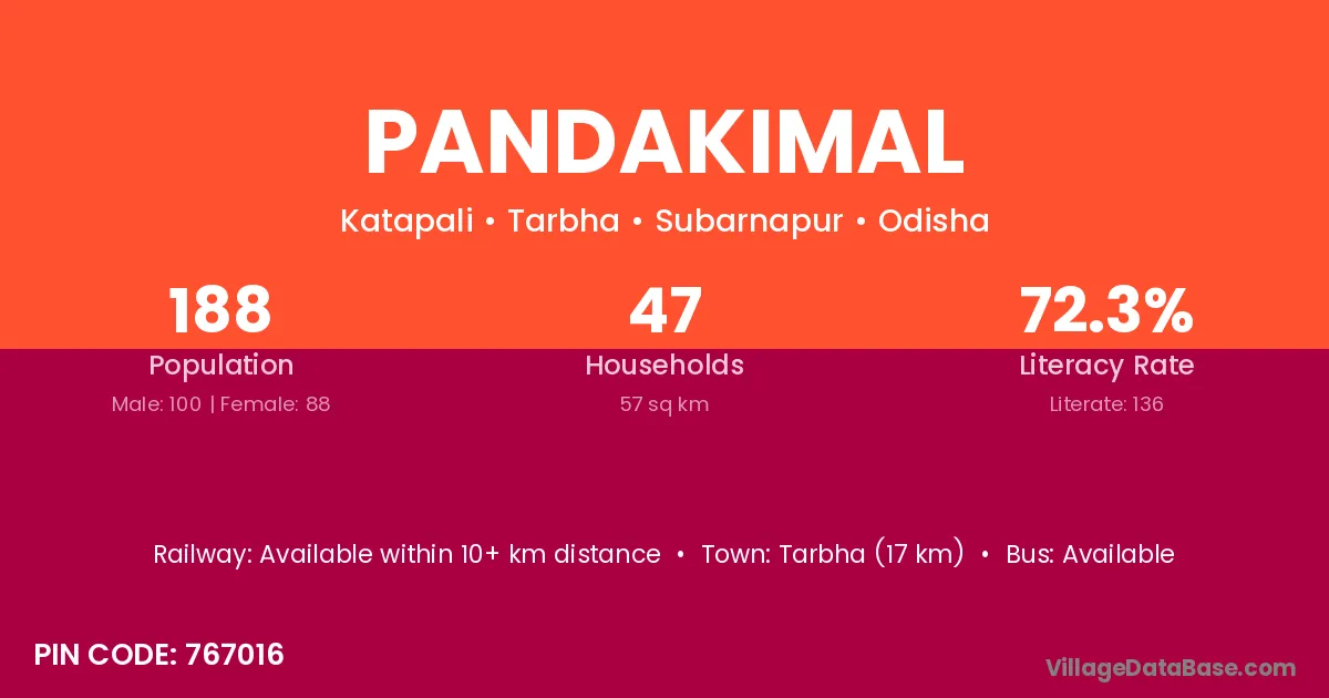 Tarbha (17 km) is the nearest town to Pandakimal village for major economic activities and is located approximately 17 km away.