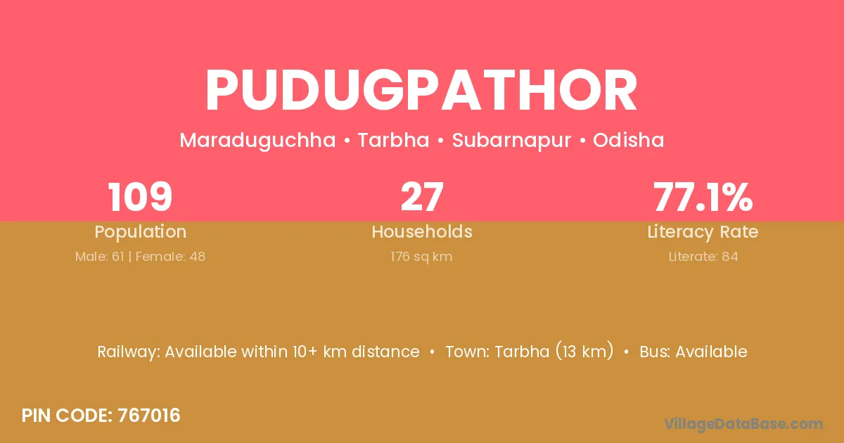Tarbha (13 km) is the nearest town to Pudugpathor village for major economic activities and is located approximately 13 km away.