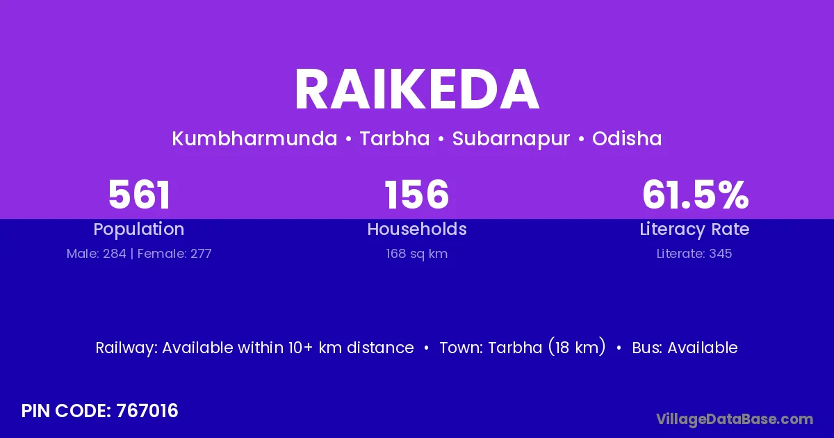 Tarbha (18 km) is the nearest town to Raikeda village for major economic activities and is located approximately 18 km away.