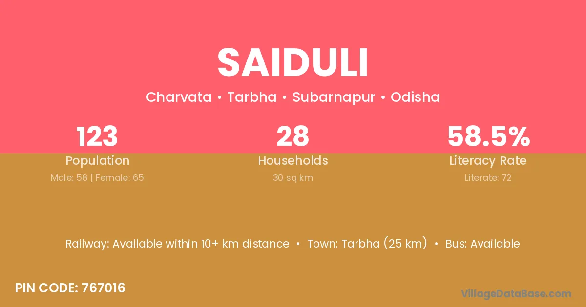 Tarbha (25 km) is the nearest town to Saiduli village for major economic activities and is located approximately 25 km away.