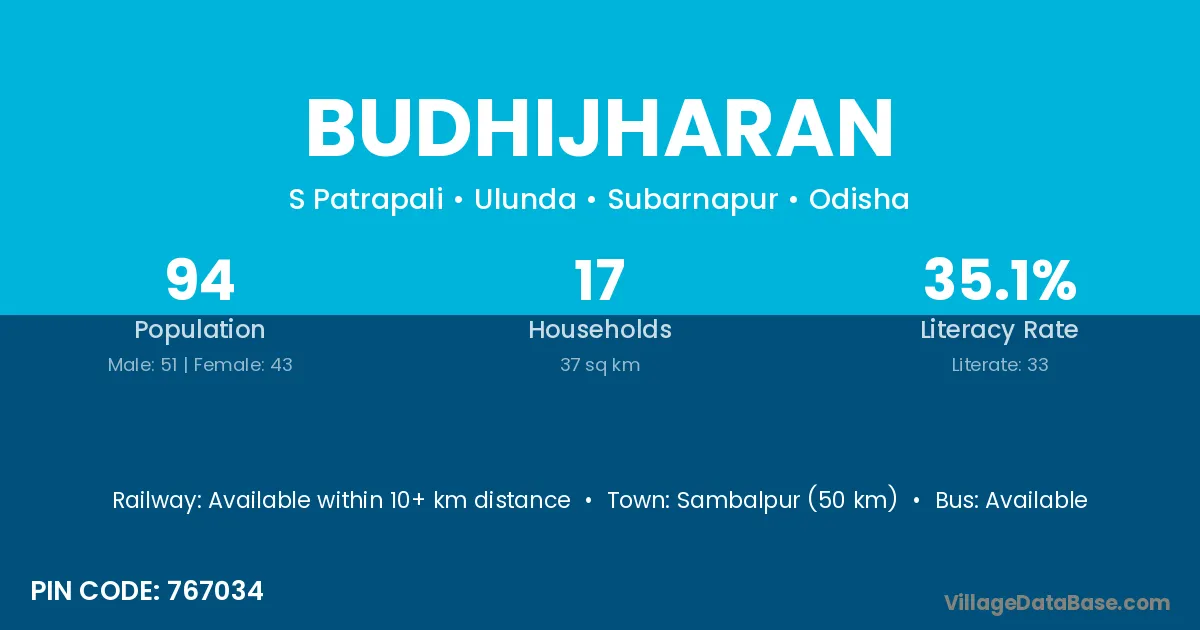 Sambalpur (50 km) is the nearest town to Budhijharan village for major economic activities and is located approximately 50 km away.