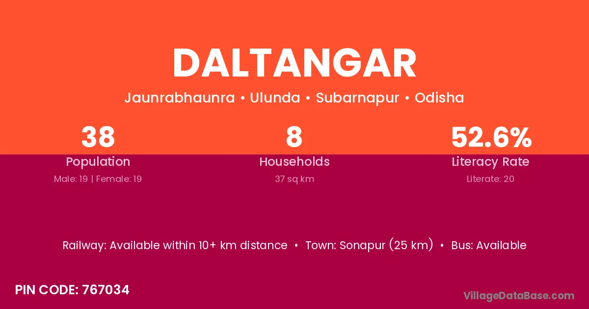 Daltangar village has a total population of 38 people, of which 19 are males and 19 are females.