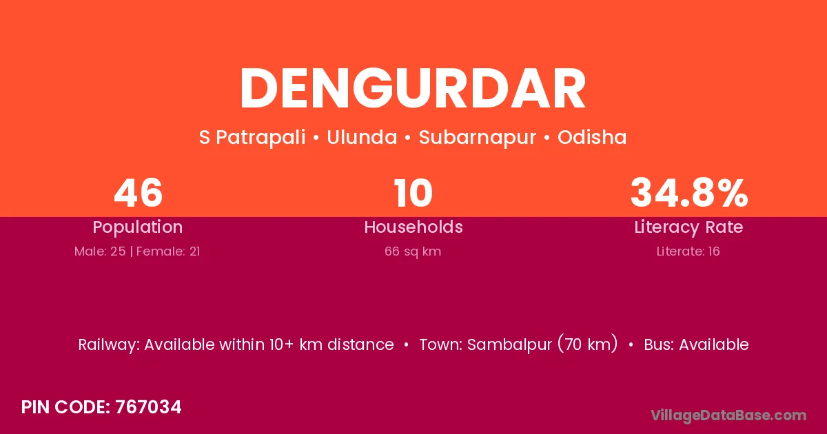 Sambalpur (70 km) is the nearest town to Dengurdar village for major economic activities and is located approximately 70 km away.