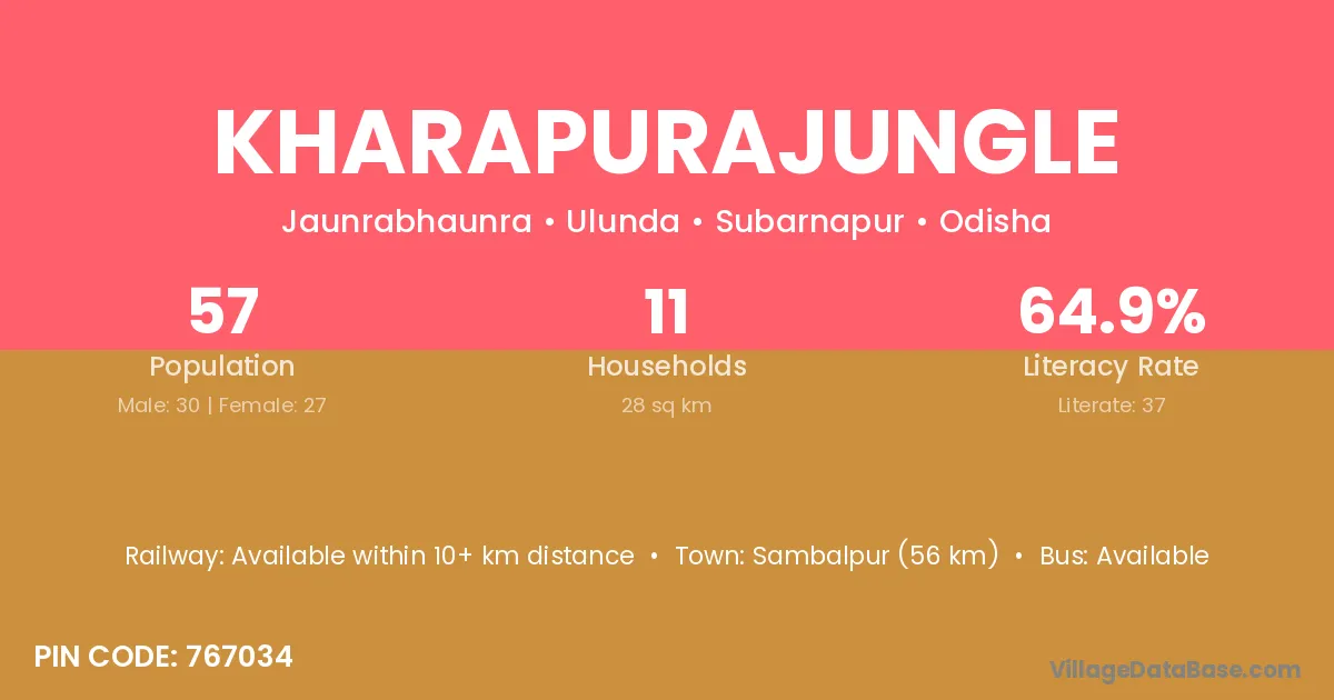 Sambalpur (56 km) is the nearest town to Kharapurajungle village for major economic activities and is located approximately 56 km away.