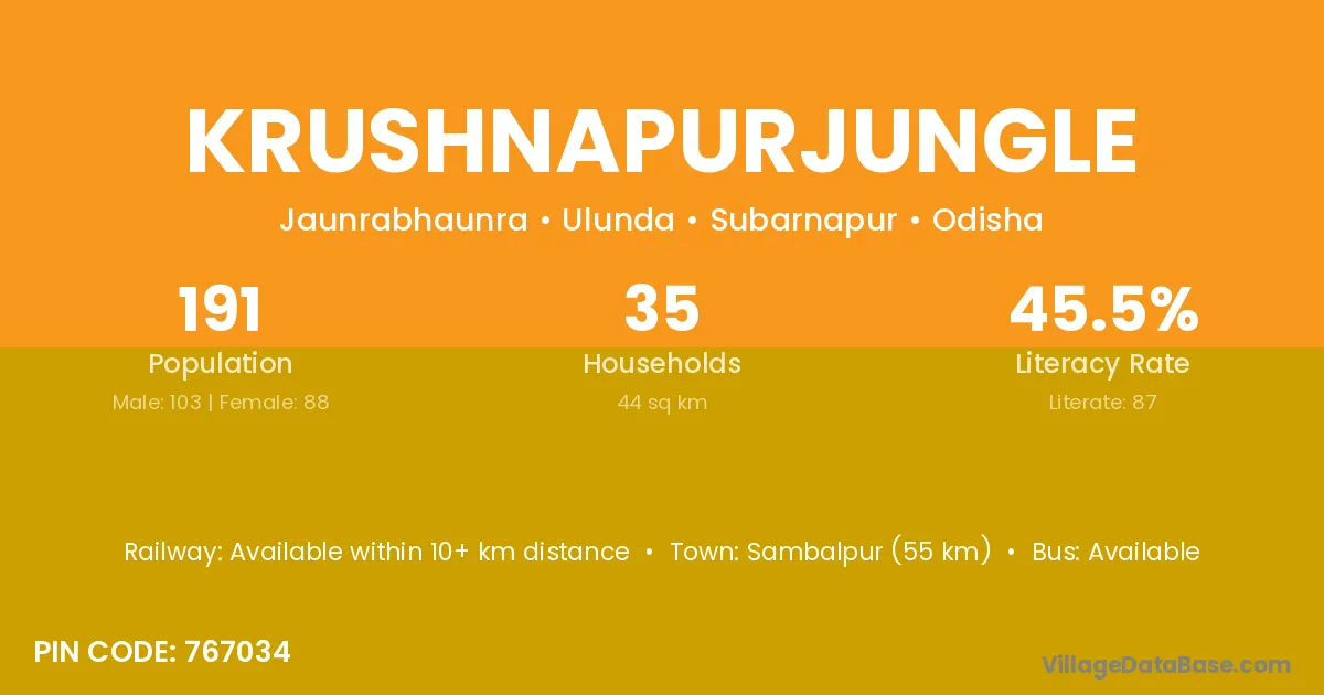 Sambalpur (55 km) is the nearest town to Krushnapurjungle village for major economic activities and is located approximately 55 km away.