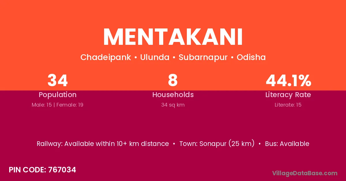 Mentakani village has a total population of 34 people, of which 15 are males and 19 are females.