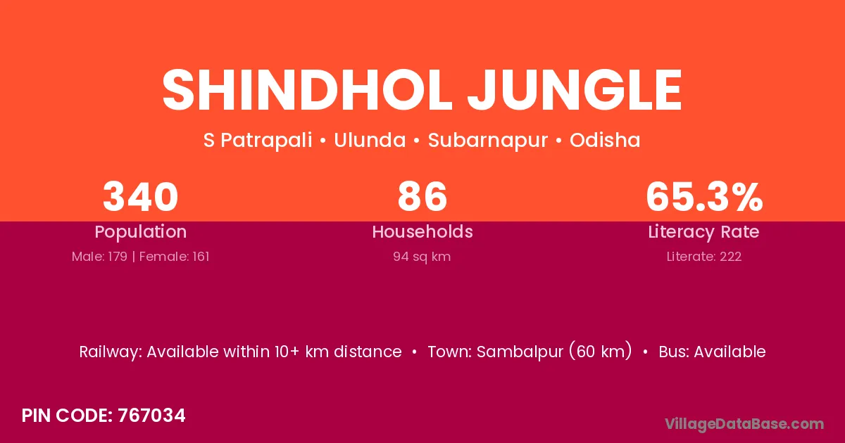 Sambalpur (60 km) is the nearest town to Shindhol Jungle village for major economic activities and is located approximately 60 km away.