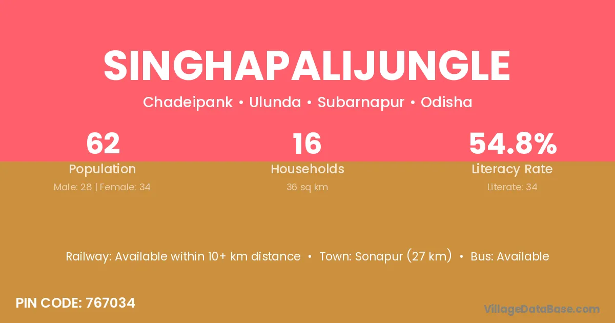 Singhapalijungle village has a total population of 62 people, of which 28 are males and 34 are females.