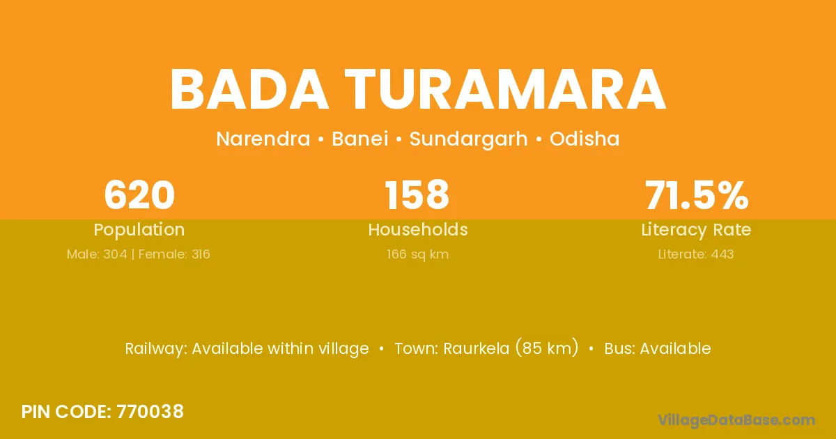 Raurkela (85 km) is the nearest town to Bada Turamara village for major economic activities and is located approximately 85 km away.
