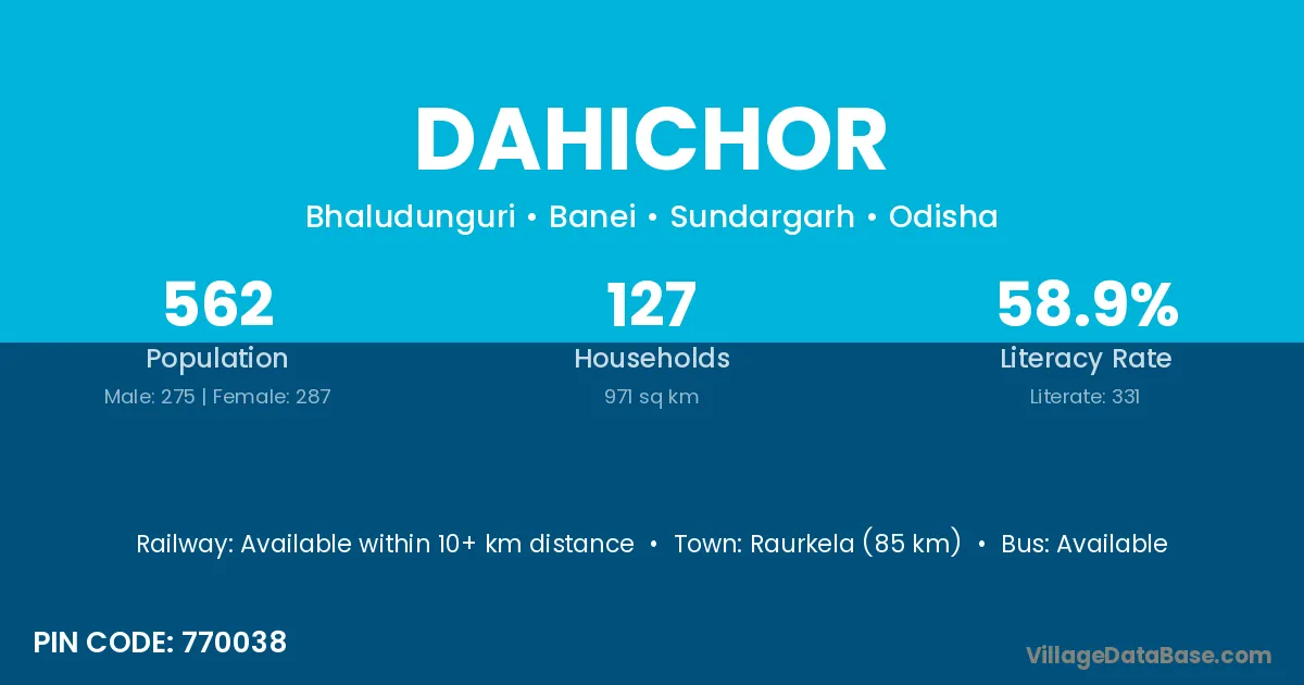 Raurkela (85 km) is the nearest town to Dahichor village for major economic activities and is located approximately 85 km away.