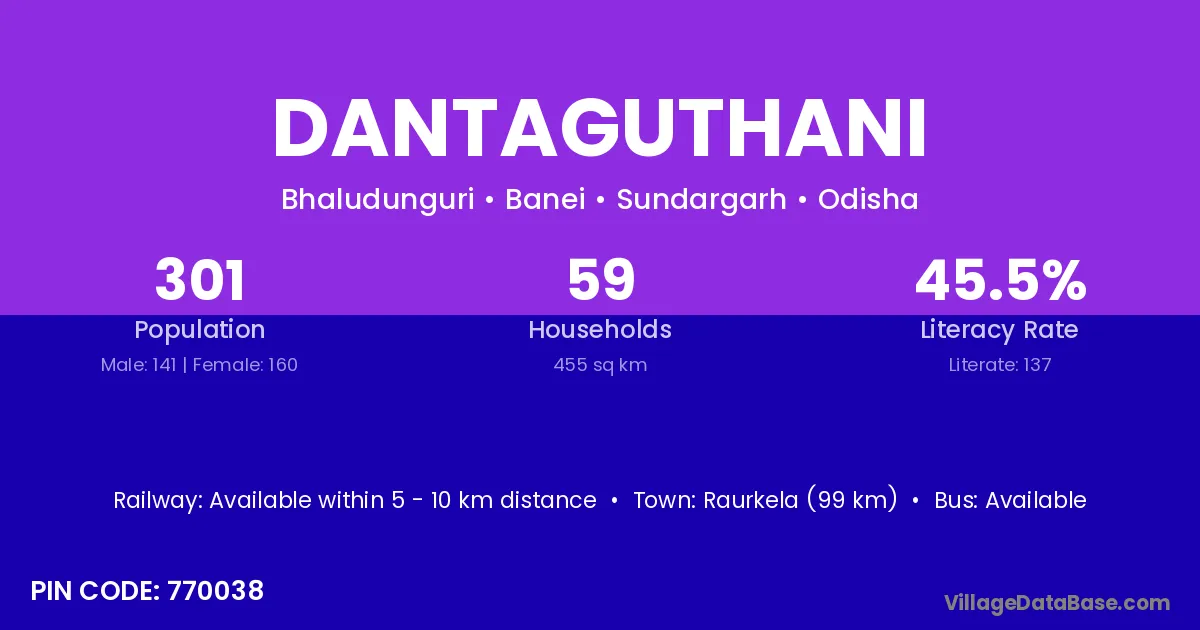 Raurkela (99 km) is the nearest town to Dantaguthani village for major economic activities and is located approximately 99 km away.