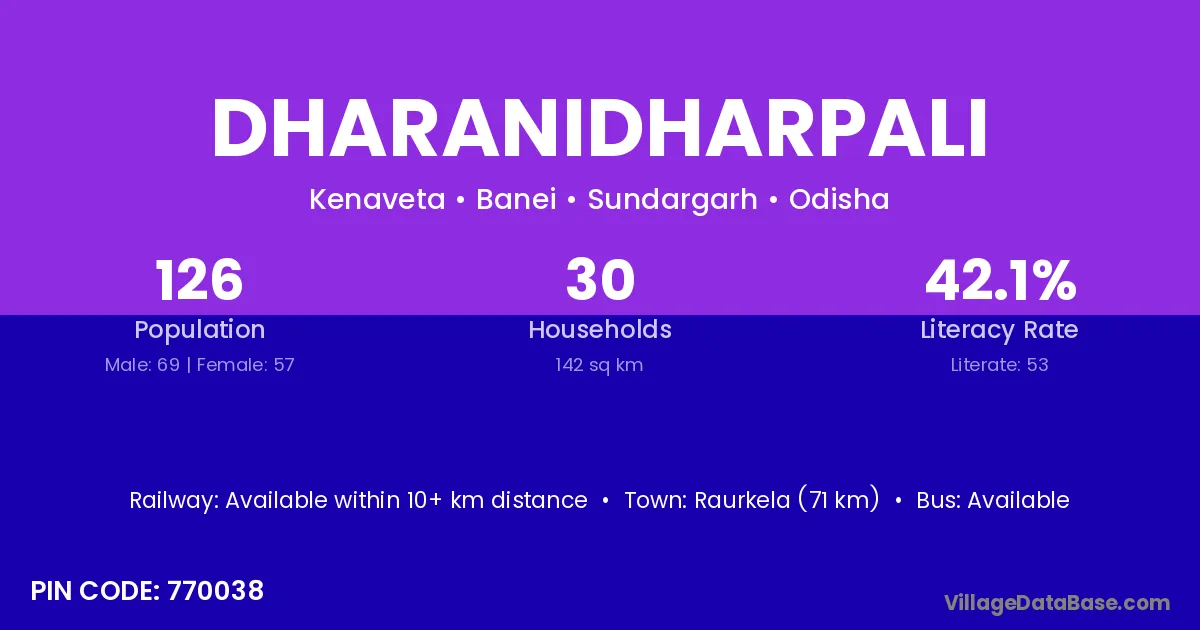 Raurkela (71 km) is the nearest town to Dharanidharpali village for major economic activities and is located approximately 71 km away.