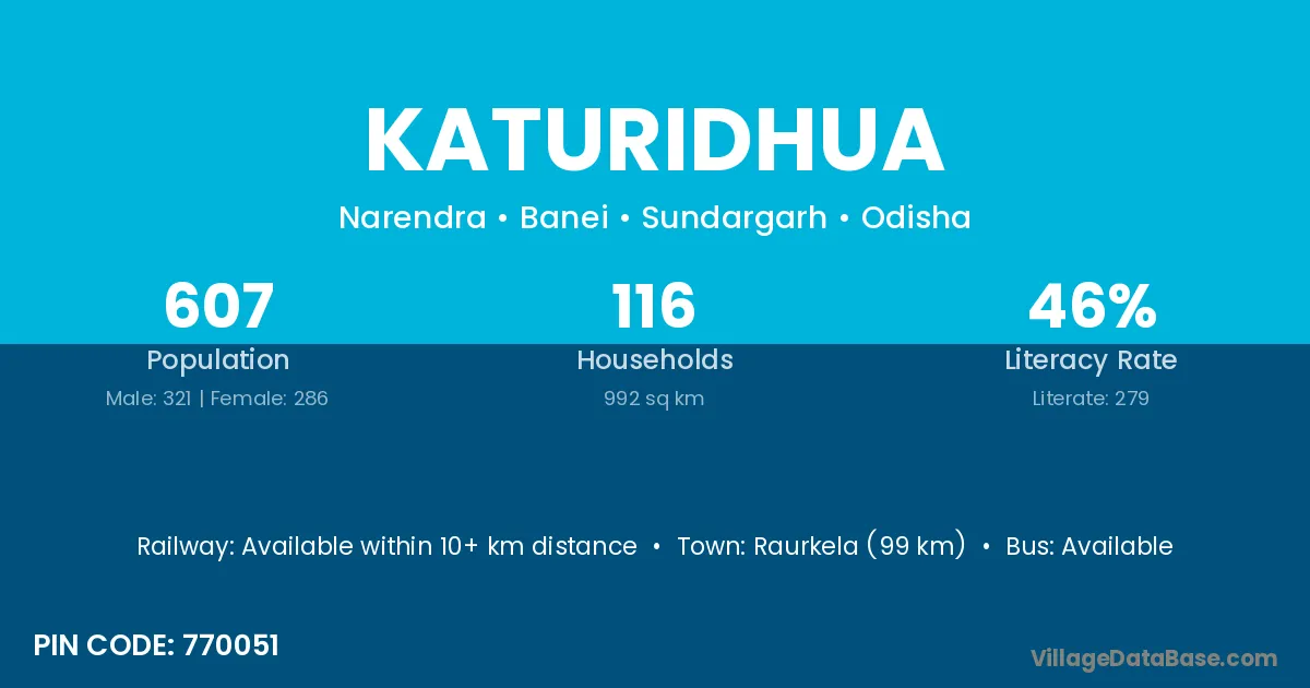 Raurkela (99 km) is the nearest town to Katuridhua village for major economic activities and is located approximately 99 km away.