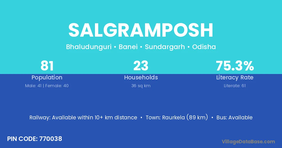 Raurkela (89 km) is the nearest town to Salgramposh village for major economic activities and is located approximately 89 km away.