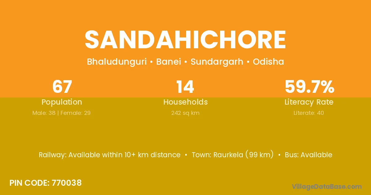 Raurkela (99 km) is the nearest town to Sandahichore village for major economic activities and is located approximately 99 km away.