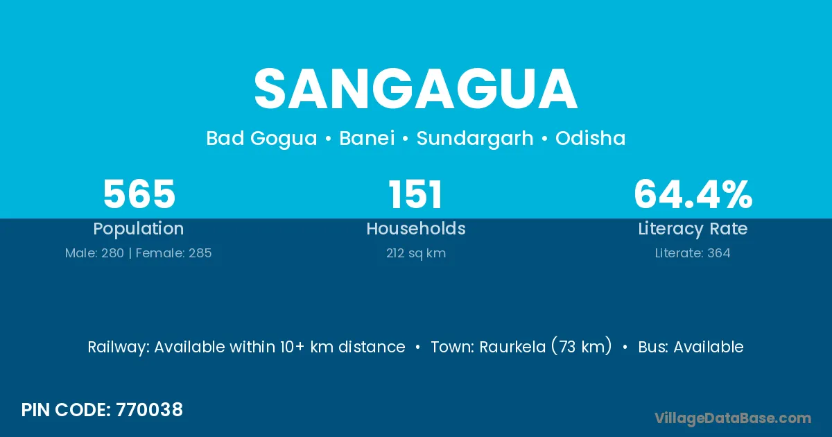Raurkela (73 km) is the nearest town to Sangagua village for major economic activities and is located approximately 73 km away.