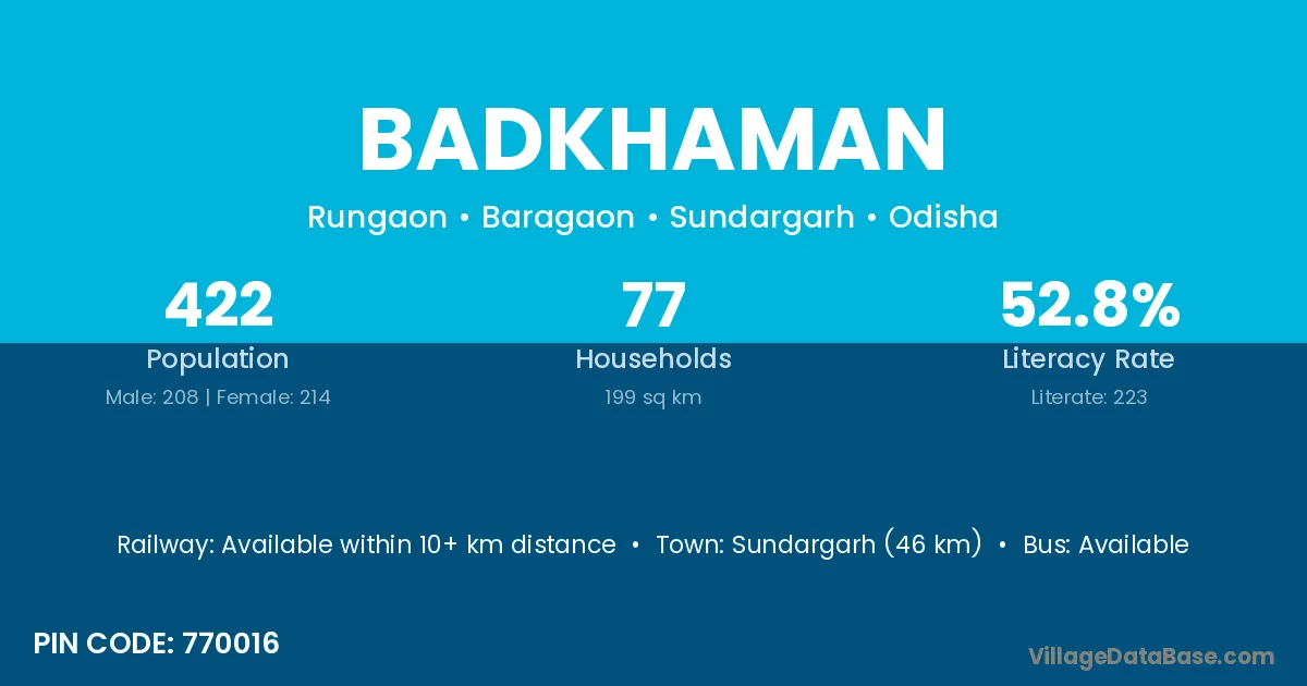 Sundargarh (46 km) is the nearest town to Badkhaman village for major economic activities and is located approximately 46 km away.