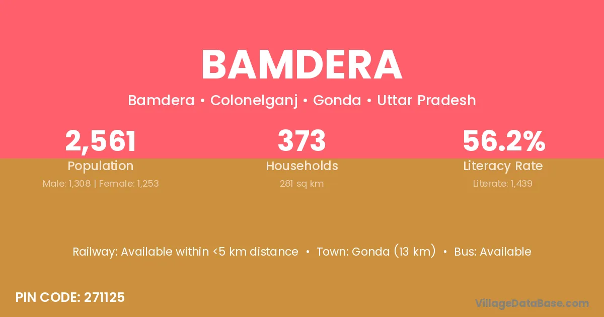 The literacy rate of Bamdera village is 56.61%. Male literacy stands at 63.85% and female literacy at 48.92%.