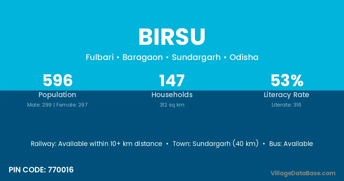 Sundargarh (40 km) is the nearest town to Birsu village for major economic activities and is located approximately 40 km away.
