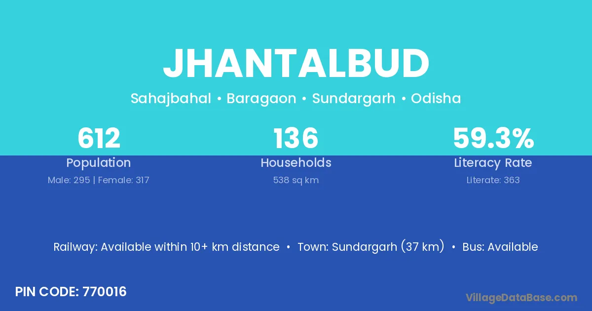Sundargarh (37 km) is the nearest town to Jhantalbud village for major economic activities and is located approximately 37 km away.