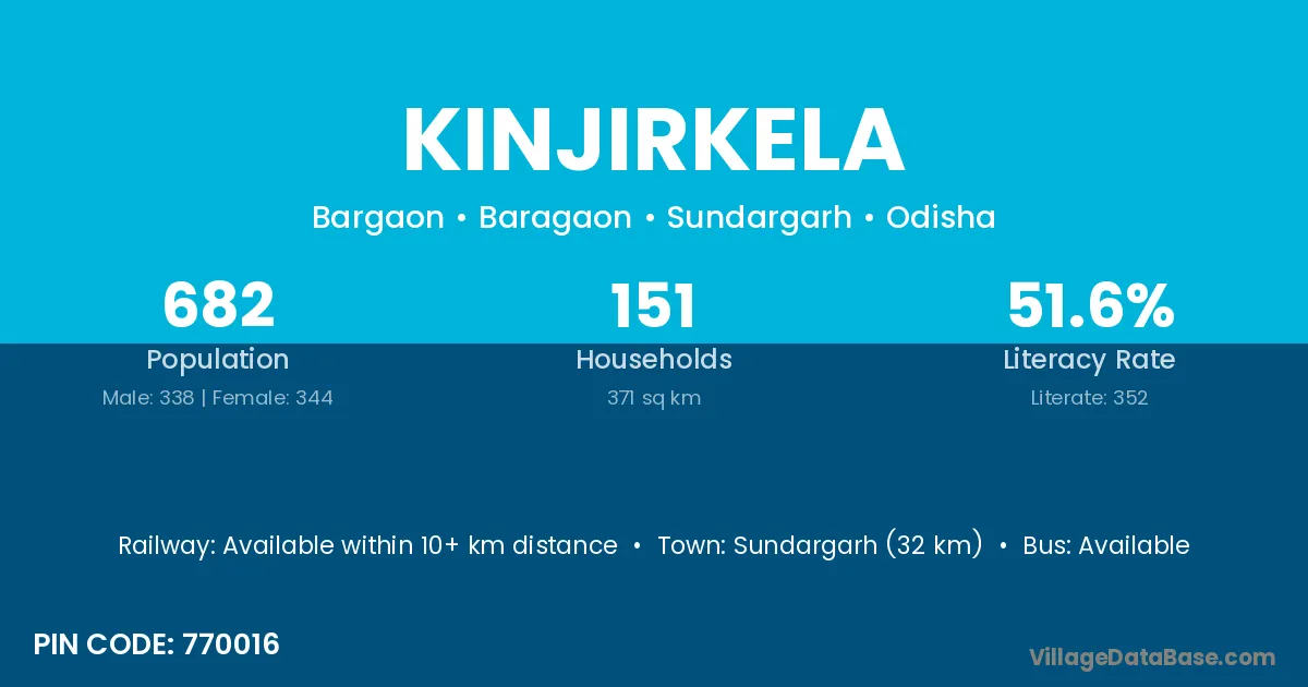 Sundargarh (32 km) is the nearest town to Kinjirkela village for major economic activities and is located approximately 32 km away.