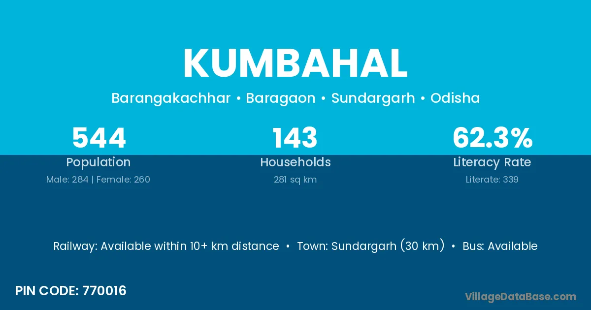 Sundargarh (30 km) is the nearest town to Kumbahal village for major economic activities and is located approximately 30 km away.