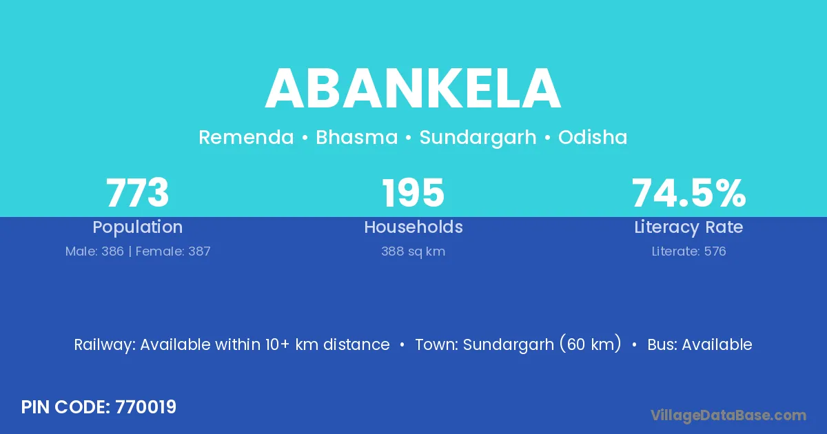 Sundargarh (60 km) is the nearest town to Abankela village for major economic activities and is located approximately 60 km away.