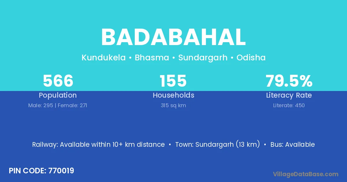 Sundargarh (13 km) is the nearest town to Badabahal village for major economic activities and is located approximately 13 km away.