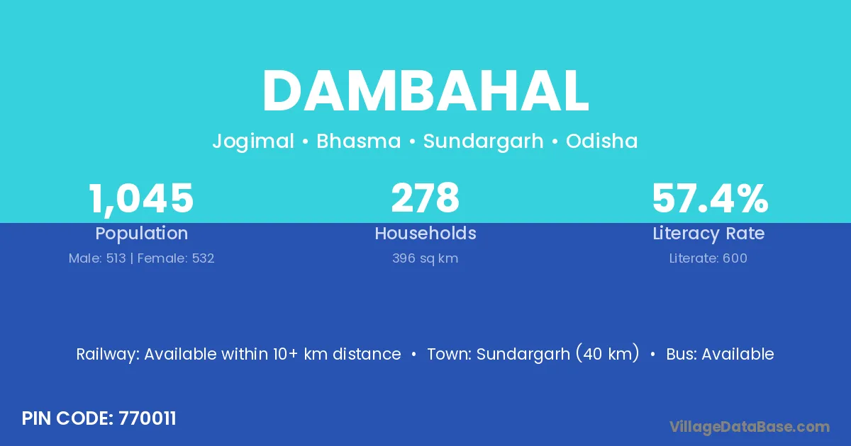 Sundargarh (40 km) is the nearest town to Dambahal village for major economic activities and is located approximately 40 km away.