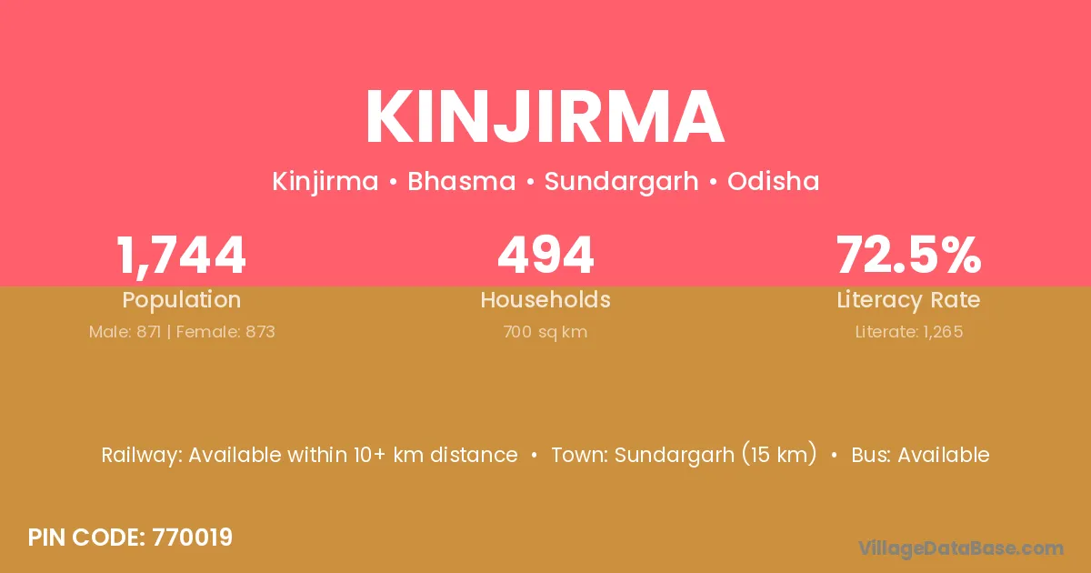 Sundargarh (15 km) is the nearest town to Kinjirma village for major economic activities and is located approximately 15 km away.