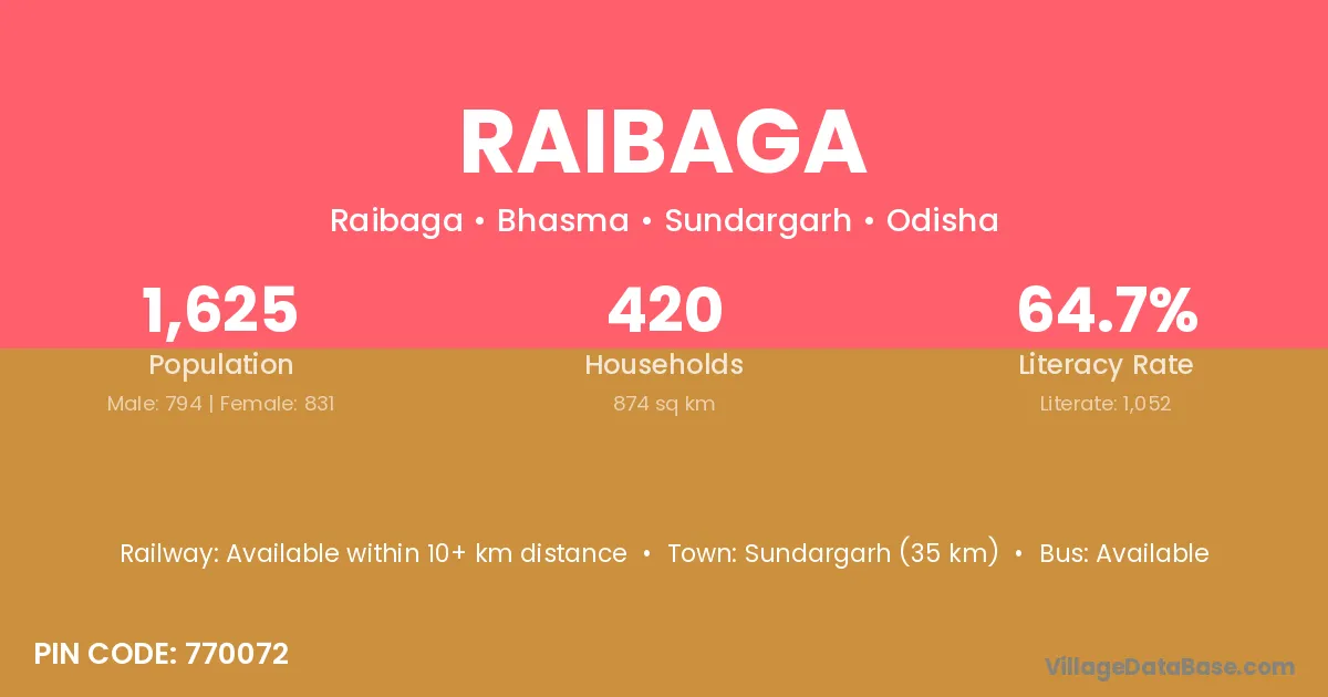 Sundargarh (35 km) is the nearest town to Raibaga village for major economic activities and is located approximately 35 km away.